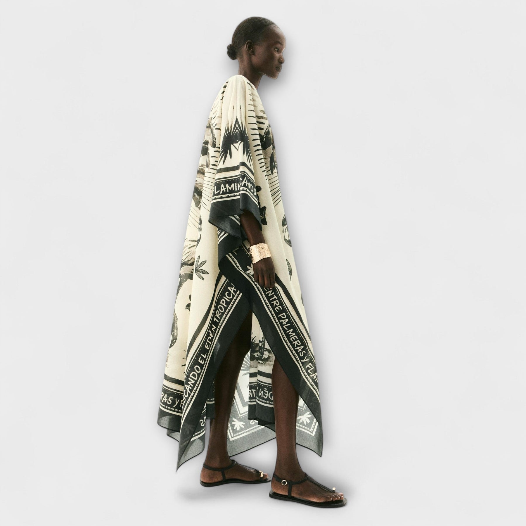 Add a touch of elegance to your holiday style with our oversized flamingo kaftan dress designed for effortless elegance and comfort. This stunning piece features a playful flamingo and palm print on a chic light beige and black base.